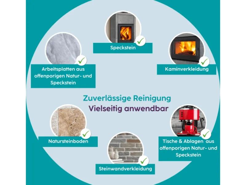 Optimal geeignet für Natur- und Specksteinöfen sowie für Arbeitsplatten, Böden und Verkleidungen aus Naturstein. Durch die starke Tiefenwirkung werden auch ältere Flecken gründlich gelöst.