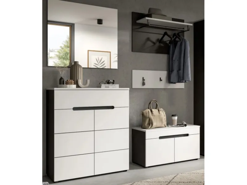 Die 5-teilige Garderobe „Cooper“ von Inn.Furn überzeugt durch ihre Funktionalität und stilvolle Optik. Mit einer Schuhkommode, einem Garderobenpaneel, einer Garderobenleiste, einem Spiegel und einer Sitzbank bietet sie umfangreichen Stauraum für Ihre Kleidung. Vier Türen, ein breiter Schubkasten und sechs geschlossene Fächer sorgen für geordnete Verwahrungsmöglichkeiten. Darüber hinaus verfügt das Garderoben Set über fünf Kleiderhaken, zwei Kleiderstangen sowie eine praktische Hutablage. Front und Oberböden in neutralem weiß harmonieren perfekt mit Korpus und Absetzungen in Basalt grau. Dank Soft-Close Funktion schließen die Türen sanft und leise. Der grifflose Look verleiht der Garderobe ein gradliniges Erscheinungsbild. Mit den Maßen ca. 175 x 180 x 37 cm ist die 5-teilige Garderobe „Cooper“ die ideale Lösung für Ihren Eingangsbereich oder Flur.
