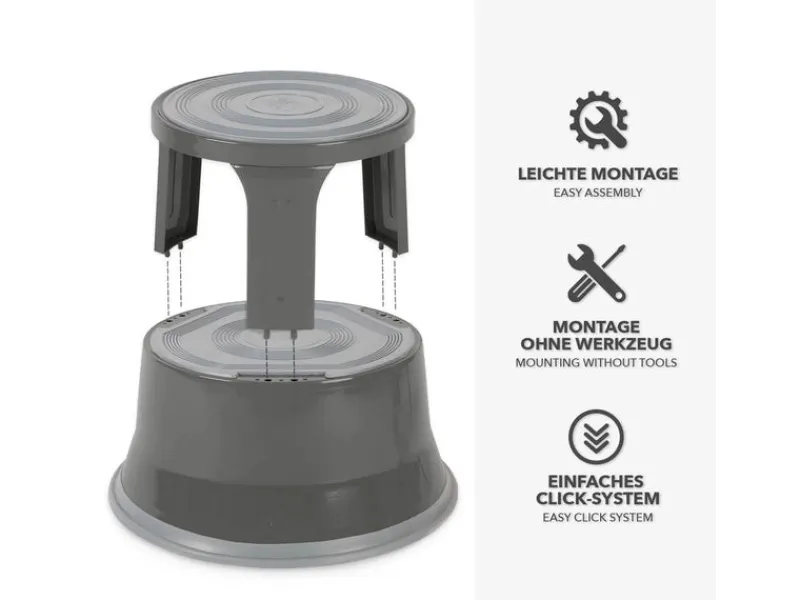 Der ausgesprochen robuste Rollhocker aus Stahl ist ein praktischer Helfer für zu Hause, das Büro oder Ladengeschäfte. Mit ihm gewinnen Sie 40 Zentimeter an Größe, wenn etwas in unerreichbaren Höhen erreicht werden soll. Aus diesem Grund sind Rollhocker auch in praktisch jeder Bücherei, jedem Archiv oder Supermarkt vorzufinden. Neben seiner originären Funktion kann der in drei Farben erhältliche „Elefantenfuß“ auch als Sitzgelegenheit für eine kurze Rast oder als Ablage genutzt werden. Die Sicherheit des Rollhockers wurde durch ein Zertifikat des TÜV Süd bestätigt.