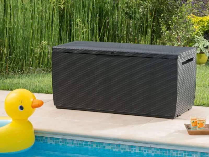 Die moderne Aufbewahrungsbox in moderner Rattanoptik kann auch als Sitzbank genutzt werden, auf der zwei Erwachsene bequem Platz finden. Die Kissenbox ist aus langlebigem, witterungsbeständigem Kunststoff für den Einsatz draußen gefertigt und leicht zu reinigen. Ihr max. Belastungsgewicht beträgt 250 kg. Die Box kann sicher verschlossen werden (Schloss ist nicht im Lieferumfang enthalten). Dank der integrierten Griffe und Rollen lässt sich die Box leicht bewegen.