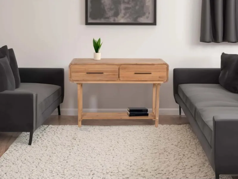 Der Konsolentisch ist ein wahres Multitalent für Ihr Zuhause, das sowohl in Funktionalität als auch in Design überzeugt. Dieses elegante Möbelstück kombiniert die Ästhetik eines klassischen Konsolentisches mit der Praktikabilität eines modernen Beistelltisches, was es zu einem idealen Begleiter für Ihren Wohnraum, Flur oder Arbeitsbereich macht. Hergestellt aus hochwertigem, gebeiztem Akazien-Massivholz, strahlt der Tisch Wärme und Natürlichkeit aus. Die sorgfältige Verarbeitung und die feinen Details unterstreichen seine Eleganz und machen ihn zu einem Blickfang in jeder Einrichtung. Seine robuste Konstruktion gewährleistet eine lange Lebensdauer und Stabilität, sodass Sie sich keine Sorgen um die Sicherheit Ihrer Gegenstände machen müssen.