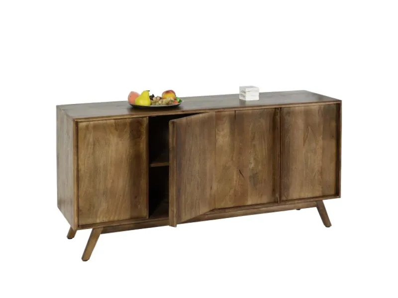 Mit insgesamt 4 Fächern und 4 Regalböden bietet Ihnen dieses Sideboard reichlich Stauraum für Ihre persönlichen Gegenstände. Die Fächer sind mit praktischen Magnetverschlüssen ausgestattet, die Ihre Dinge sicher verwahren und gleichzeitig leicht zugänglich machen. Das Sideboard wird komplett mit Fußbodenschonern geliefert, um Ihre Böden vor Kratzern und Abnutzung zu schützen. Mit diesem Sideboard holen Sie sich nicht nur ein funktionales Möbelstück, sondern auch ein zeitloses Kunstwerk in Ihr Zuhause. Machen Sie Ihren Wohnraum zu einem Ort des Stils und der Organisation mit unserem Sideboard aus Mangoholz.