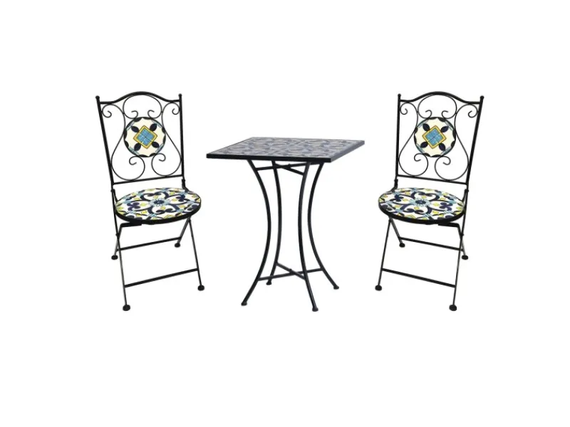 3tlg Mosaik Gartengarnitur Set im mediterranen Design, Entdecken Sie unser stilvolles 3tlg Mosaik Gartengarnitur Gartenmöbel Set, das Ihrem Außenbereich einen Hauch von mediterranem Flair verleiht.Dieses Set besteht aus einem eleganten eckigen Tisch und zwei klappbaren Gartenstühlen, die sowohl Funktionalität als auch Ästhetik vereinen.Der Tisch hat die idealen Maße von L61 x B61 x H70 cm und ist aus robustem, pulverbeschichtetem Eisen gefertigt,was ihn besonders langlebig und wetterbeständig macht.Das wunderschöne Mosaik Design auf der Tischoberfläche zieht alle Blicke auf sich und sorgt für eine einladende Atmosphärein Ihrem Garten oder auf Ihrer Terrasse.Die klappbaren Gartenstühle sind nicht nur praktisch, sondern auch ein echter Hingucker.Mit den Maßen L42 x B53 x H88 cm und einer Sitzhöhe von 48 cm bieten sie optimalen Komfort.Die Sitzfläche und die Rückenlehne sind ebenfalls mit dem ansprechenden Mosaik Design verziert, was das Gesamtbild harmonisch abrundet.Jeder Stuhl ist bis zu 120 kg belastbar, sodass Sie sich keine Sorgen um Stabilität und Sicherheit machen müssen.Dieses Mosaik Gartengarnitur Set ist perfekt für gesellige Abende im Freien, entspannte Nachmittage mit einem Buch oder einfach nur,um die Sonne zu genießen.Dank der klappbaren Funktion lassen sich die Stühle leicht verstauen, wenn sie nicht in Gebrauch sind.Verleihen Sie Ihrem Garten mit diesem einzigartigen Möbelset einen mediterranen Charme und genießen Sie unvergessliche Momente im Freien.Bestellen Sie jetzt und verwandeln Sie Ihren Außenbereich in eine Oase der Entspannung!