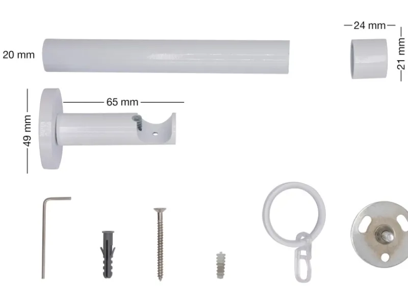1 mydeco Ø 20 mm Rohr der Länge 170 cm, 2 Endstücke cap, 2 Träger, 20 Ringe, Schrauben, Imbus.