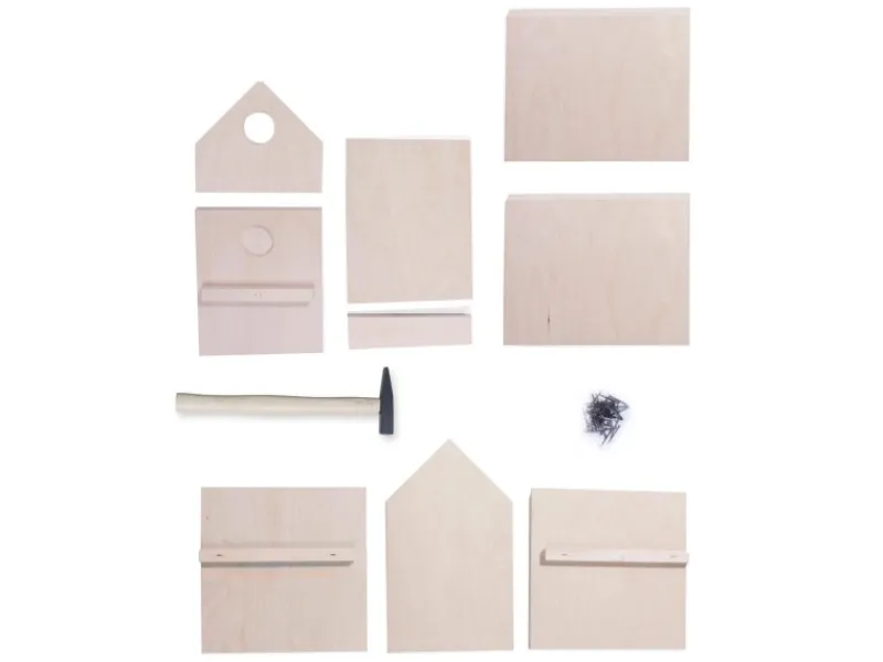 Enthält neun Holzplatten, Nägel und einen kleinen Hammer