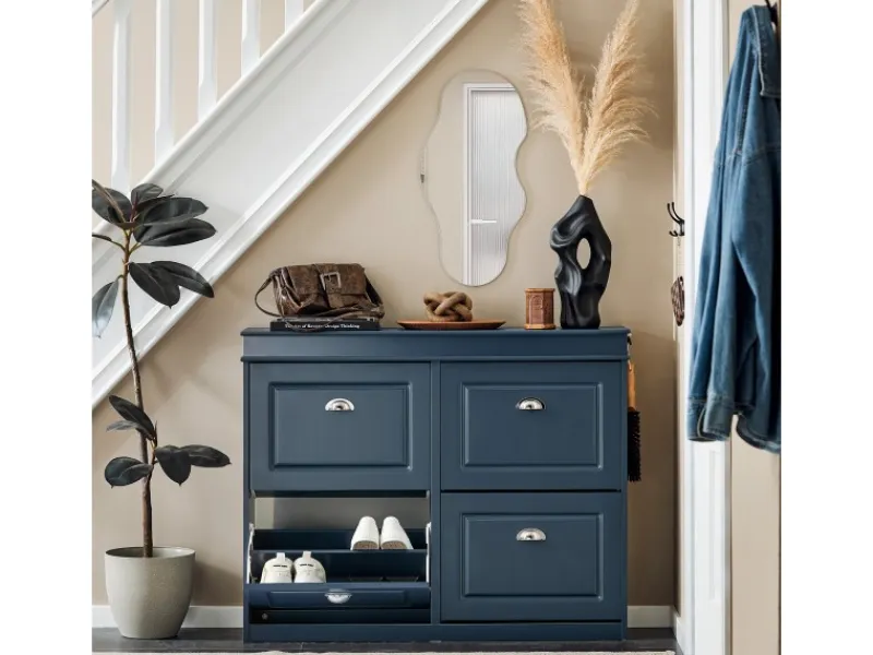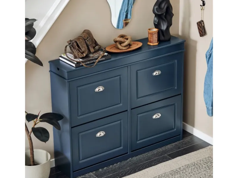 Hochwertige Scharniere sorgen für ein leichtgängiges Öffnen. Die klassische Farbe und die Metallgriffe machen es perfekt für jeden Eingangsbereich.