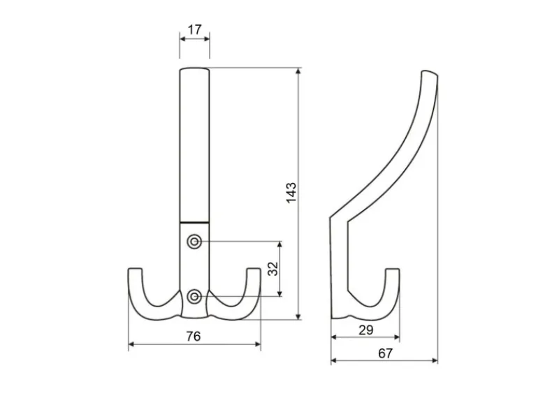 Abmessungen – Gesamthöhe 143 mm / Gesamtbreite 76 mm / Bohrlochabstand 32 mm / Tiefe 67 mm