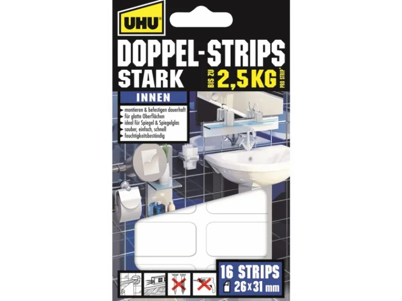 Die Uhu Doppelstrips stark 16 Stück, sind extra-starke, doppelseitige Klebestrips zum dauerhaften Montieren und Befestigen im Innenbereich. Die einfache Alternative zu Schrauben und Nägeln. Hält dauerhaft und sicher auf fast allen glatten Oberflächen, wie z.B. auf Metall, Fliesen, Kacheln, Kunststoffen, Glas und lackiertem Holz. Ideal zur Montage von Spiegeln, Halterungen, Schildern, Haken, Ablageelementen, Dekorationsobjekten, Zierleisten uvm. Voll belastbar nach 60 Minuten. Feuchtigkeitsbeständig.