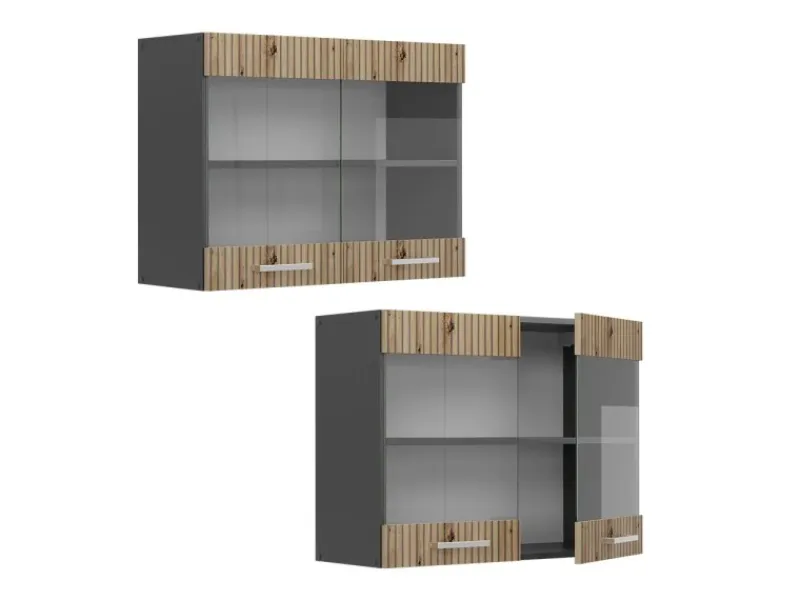 Die Hängevitrine hat Breite 80 cm, Höhe 60 cm und Tiefe 31 cm