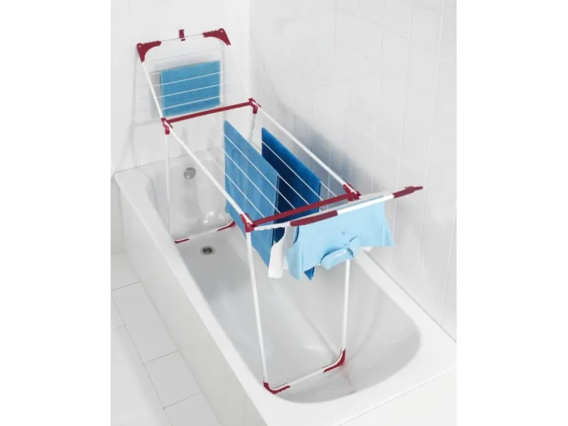 Durch das robuste Metall mit bordeaux-farbenen Kunststoff-Ecken, hat der Wäsche Trockner Summer Dry einen besonders stabilen Halt. Durch einen integrierten Clip an beiden Flügeln können diese verbunden werden und „wedeln“ beim Transport nicht herum. So klappt beim Verstauen nichts aus. Zudem können am Clip auch Utensilien wie ein Wäscheklammerbeutel aufgehängt werden. Die bordeaux-farbenen Eck-Kappen besitzen eine Kleiderbügelvorrichtung für mehr Platz zum Trocknen. Bei einer Gesamttrockenlänge von 13 m findet jedes Wäschestück seinen geeigneten Platz.