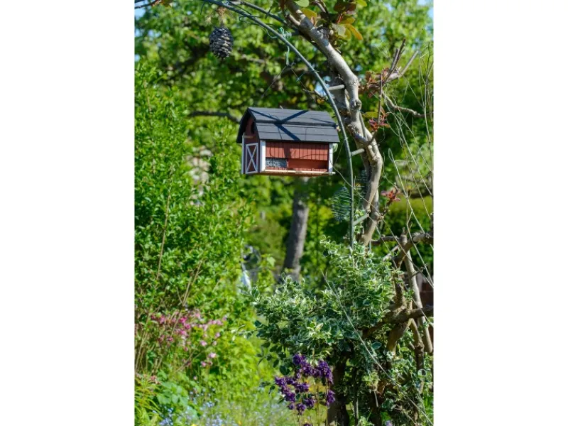 Das Vogelhaus besteht aus FSC®-zertifiziertem Holz und ist wetterfest lasiert