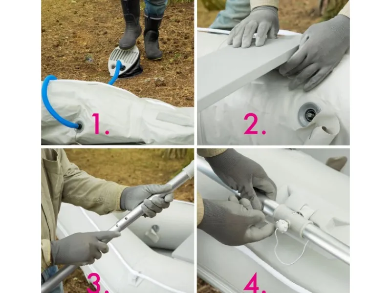 Das Paddelboot besitzt 3 Luftkammern + 1 Kielkammer, die sich mit Hilfe der im Lieferumfang enthaltenen Pumpe unkompliziert befüllen lassen. Das Reparaturset enthält alles notwendige, um im Notfall kleine Schäden noch während des Ausfluges beheben zu können.