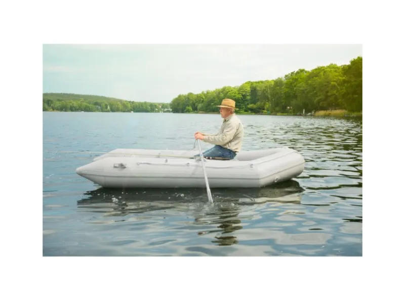Mit Hilfe der seitlichen Tragegriffe und der seitlich befestigten Leine lässt sich das Boot bequem transportieren und im Wasser leicht in Position bringen. Das Boot kann platzsparend zusammengelegt werden und in der Tragetasche sicher bis zum nächsten Ausflug verstaut werden.