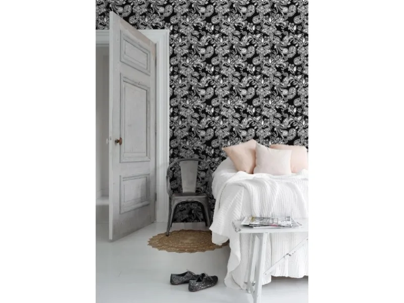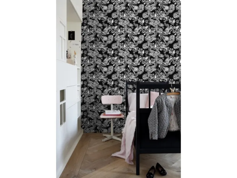 Diese fröhliche Tapete mit funky Blumen und Paisleys in Schwarz und Weiß lässt jedes Mädchenherz höher schlagen. Kombiniert mit hellen Farben und natürlichen Materialien, entsteht eine angenehme Atmosphäre, die zum Spielen, Lachen, Lesen und Träumen einlädt.Maße, Rapport und Musterversatz Die Maße dieser Tapete sind 53 cm x 10. 05 m (Breite x Länge). Der Rapport ist 53 (gerader Ansatz). Das heißt, dass das Motiv sich alle 53 cm wiederholt und das Muster der einzelnen Tapetenbahnen auf gleicher Höhe geklebt werden muss.Tapezieren Das Anbringen dieser Vliestapete ist einfach und unkompliziert: nachdem der Vlies-Kleister direkt auf die Wand aufgebracht wurde, kann die Tapete angesetzt und anschließend glattgestrichen werden. Eventuelle Überstande können mit einem Cuttermesser entfernt werden. Beim Tapezieren wird kein Tapeziertisch benötigt und die Tapete ist auch nach Jahren restlos trocken abziehbar. Für das beste Tapezierergebnis empfiehlt ESTAhome den professionellen Wallpro PRO-301 Tapetenkleister. Vorbereitungstipp: Verhindere Probleme mit der Haftung deines Tapeten, indem du vorher testest, ob deine Wandoberfläche stark saugend ist. Nimm dazu einen feuchten Schwamm und befeuchte einen kleinen Teil der Wand. Wenn der feuchte Bereich innerhalb weniger Sekunden verschwindet, ist die Wand sehr saugfähig. In diesem Fall empfehlen wir, ein Grundiermittel zu verwenden, um die Saugfähigkeit zu verringern. ESTAhome empfiehlt hierfür die WALL PRO-401 Tapetenprimer.Sofort startklar! Am einfachsten ist es, direkt auch der benötigte Tapetenkleister und ein Wallpro PRO-933 Tapezierset zu bestellen. Dieses Tapezierset enthält alle Tapezierwerkzeuge, die beim Tapezieren von Vliestapeten benötigt werden. Diese Artikel können über das Suchfenster auf der Amazon Seite schnell gefunden und bestellt werden. So wird das Tapezieren zum Kinderspiel!