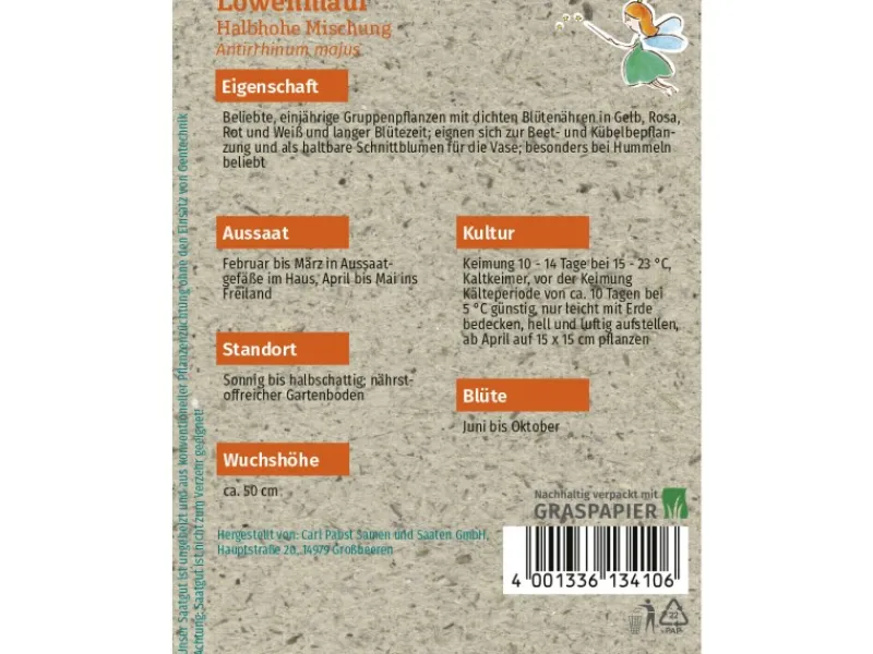 Beliebte, einjährige Gruppenpflanzen mit dichten Blütenähren in Gelb, Rosa, Rot und Weiß und langer Blütezeit. Löwenmaul ist besonders bei Hummeln beliebt und eignet sich zur Beet- und Kübelbepflanzung und als haltbare Schnittblumen für die Vase.Aussaat: Februar bis März in Aussaatgefäße im Haus, April bis Mai ins Freiland.Kultur: Keimung 10-14 Tage bei 15-23 °C, Kaltkeimer, vor der Keimung Kälteperiode von ca. 10 Tagen bei 5 °C günstig, nur leicht mit Erde bedecken, hell und luftig aufstellen, ab April auf 15×15 cm pflanzen.Standort: Sonnig bis halbschattig, nährstoffreicher, kalkarmer Boden.Blüte/Ernte: Juni bis Oktober.Inhalt: reicht für ca. 200 Pflanzen