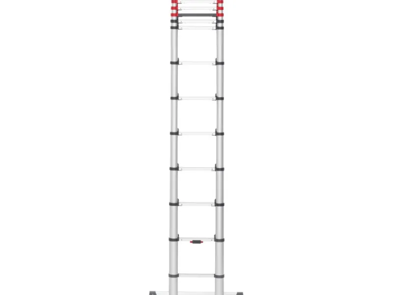 Dank des Sicherheitsabstands zwischen den Sprossen besteht keine Klemmgefahr. Zudem lässt sich der Verriegelungsstatus durch die farbige Verriegelungsanzeige an jeder Sprosse leicht erkennen. Große Kunststoff-Füße und Quertraverse, der gummierte Wandstoßschutz sowie der Transportgurt sind weitere Ausstattungsmerkmale der Hailo Alu-Teleskopleiter.