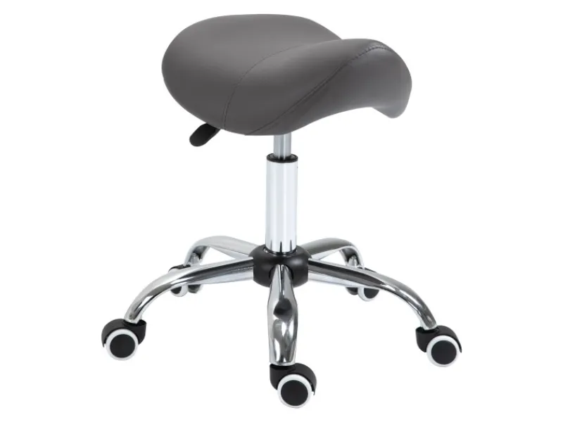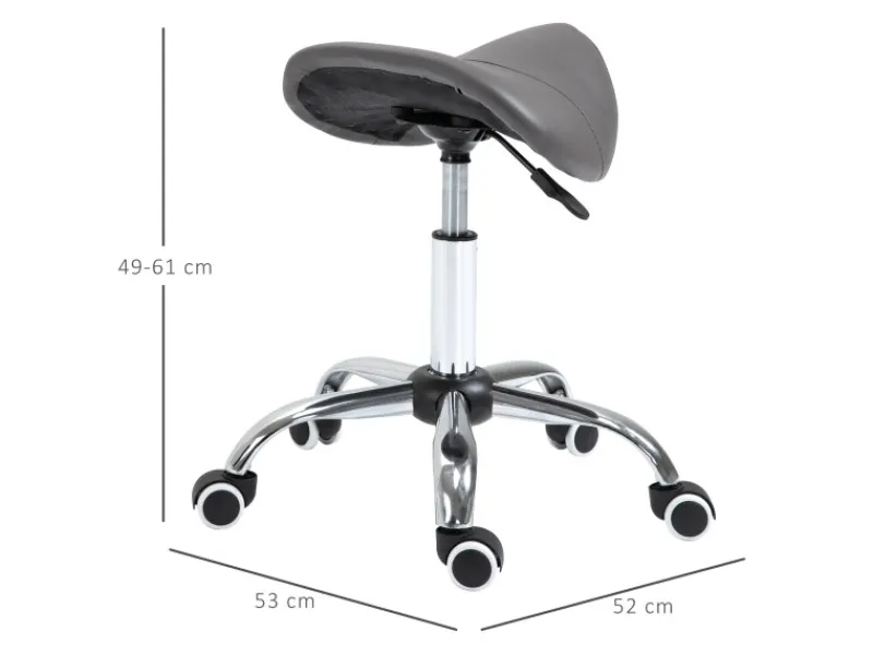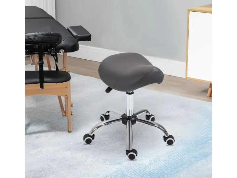 Dieser ergonomische Rollhocker in Sattelform von HOMCOM sorgt durch seine besondere Form des Sitzes automatisch für ein aufrechtes Sitzen, welches die Wirbelsäule entlastet. Der Praxishocker ist mit einer komfortablen Gasfeder ausgestattet, höhenverstellbar und drehbar. Die gepolsterte Sitzfläche ist aus glattem, pflegeleichtem Kunstleder hergestellt. Der Kreuzfuß des Hockers ist mit fünf stabilen Nylonlaufrollen ausgestattet. Der praktische Hocker ist ideal für den täglichen Gebrauch zu Hause, in jedem Friseursalon, Kosmetik-Studio oder in Büros.