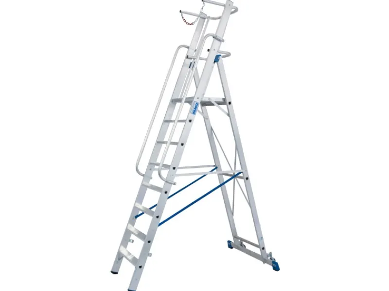 Die großzügige Standplattform misst 50 cm x 45 cm und bietet ausreichend Platz für bequemes Arbeiten. Beidseitig angebrachte Handläufe garantieren einen sicheren Auf- und Abstieg. Eine stabile Quertraverse mit integrierten Fahrrollen ermöglicht sowohl einen sicheren Stand als auch einen einfachen Transport der Leiter.