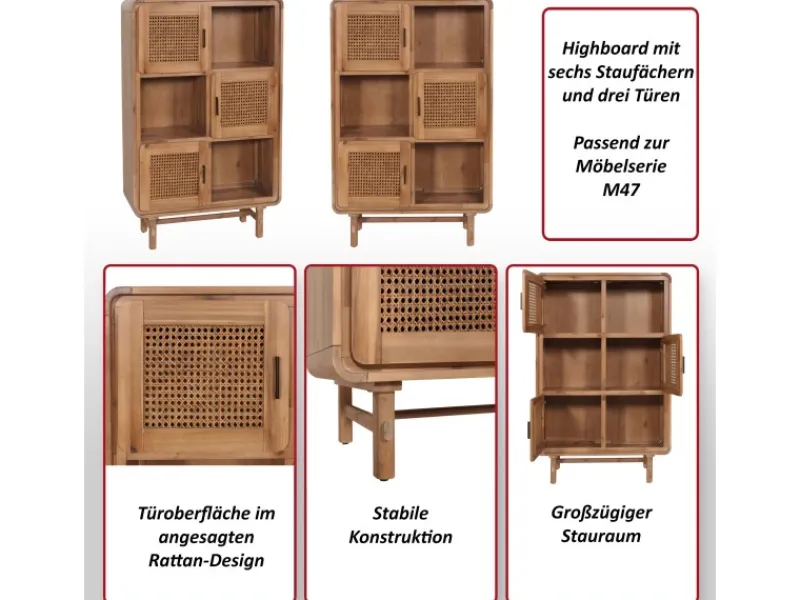 Entdecken Sie das Highboard M47 – die perfekte Ergänzung für Ihr Zuhause! Dieses vielseitige Möbelstück vereint Stil und Funktion auf beeindruckende Weise und wird Ihr Wohnzimmer, Esszimmer oder Schlafzimmer in einen eleganten Raum verwandeln. Mit seiner einzigartigen Türoberfläche im angesagten Rattan-Design verleiht das Highboard Ihrem Raum einen Hauch von Exotik und Eleganz. Die Kombination aus Rattan und gebeiztem Akazie-Massivholz verleiht diesem Möbelstück eine zeitlose Schönheit und verleiht Ihrem Zuhause eine warme und einladende Atmosphäre.