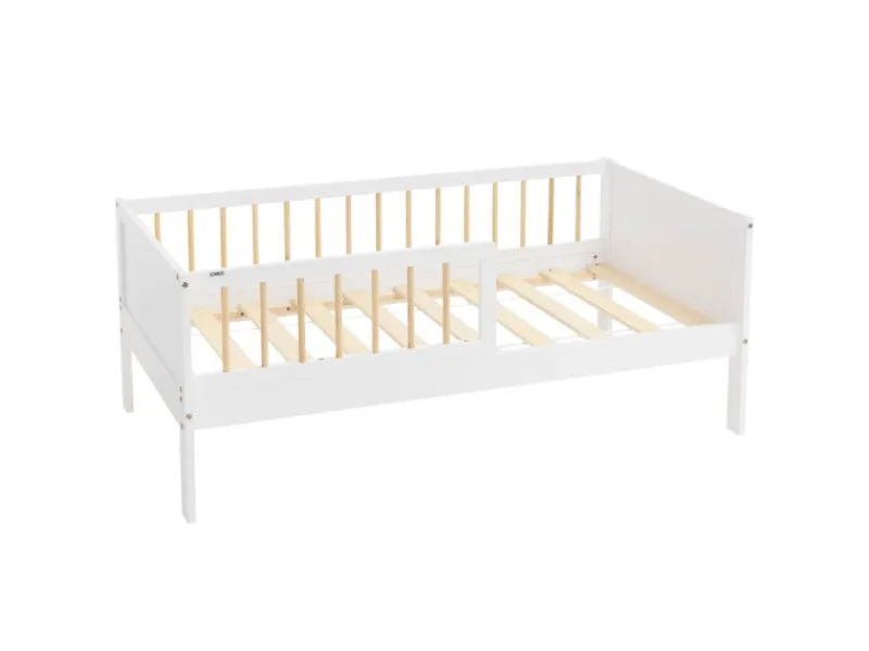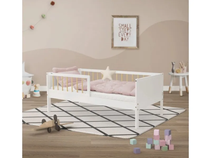 Gestalte das Schlafzimmer deines Kindes mit diesem hochwertigen Kinderbett aus Kiefernholz. Mit seinen Maßen von 70 x 140 cm ist es perfekt für die Übergangszeit vom Babybett zum größeren Bett geeignet. Der robuste Rahmen aus Kiefernholz sorgt für Stabilität und eine Optik, die in jedes Kinderzimmer passt. Dank des integrierten Rausfallschutzes schläft dein Kind sicher und geborgen – auch wenn es sich nachts viel bewegt. Bitte beachte, dass die Matratze nicht im Lieferumfang enthalten ist, sodass du die perfekte Matratze für die Bedürfnisse deines Kindes auswählen kannst.