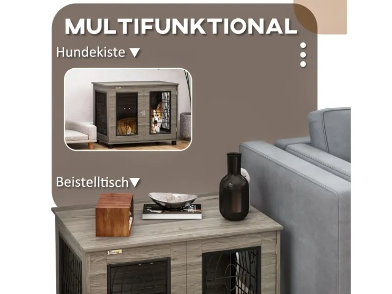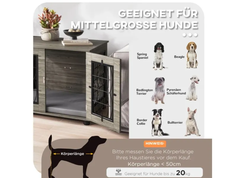 Entdecken Sie diese PawHut Hundebox – das perfekte Zusammenspiel von Stil und Funktionalität. Diese Box dient als sicherer, geborgener Rückzugsort für Ihren Hund, während die große obere Ablagefläche ideal für Hundefutter, Spielzeuge u. v. m. geeignet ist. Der Hundekäfig verfügt über ein waschbares, weiches Liegekissen, das maximalen Komfort für Ihr Haustier garantiert. Die vordere, verriegelbare Tür sorgt für Sicherheit, während das Gitter an drei Seiten eine hervorragende Belüftung fördert.
