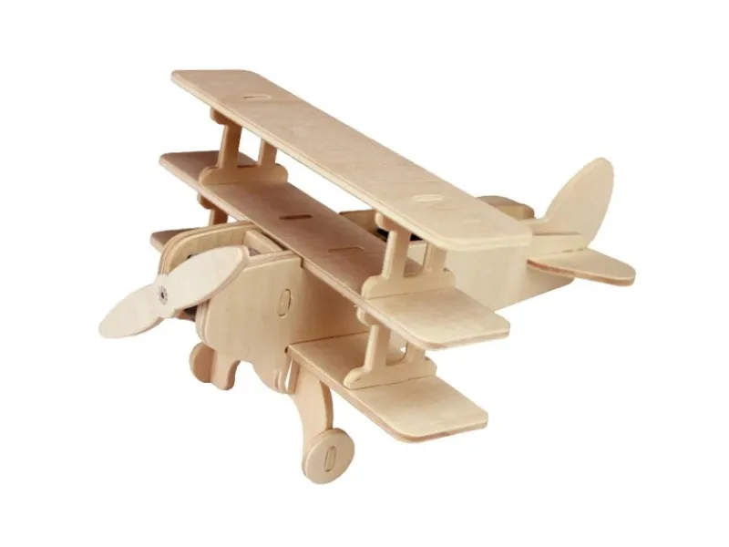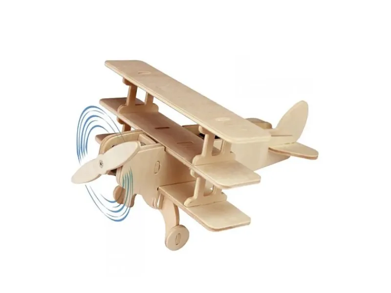 Die Teile des Bausatzes sind auf Holzplatten vorgestanzt und müssen lediglich herausgebrochen und zusammengesteckt werden. Einmal zusammengebaut, wird der Propeller des Dreideckers durch einen solarbetriebenen Motor angetrieben.