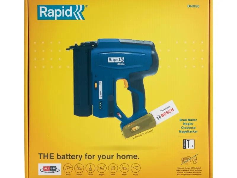 Der Akku-Nagler BNX50 ist Teil der Bosch Power For All Akku-Allianz. Daher kann der Akku der Rapid 18 V Geräte auch mit einer Vielzahl von Produkten von Marken wie Bosch, Gardena, Gloria und Wagner verwendet werden. Empfohlen wird der P4A-Akku mit 2,5 Ah, mit dem sich pro Ladung bis zu 600 Nägel verarbeiten lassen.
