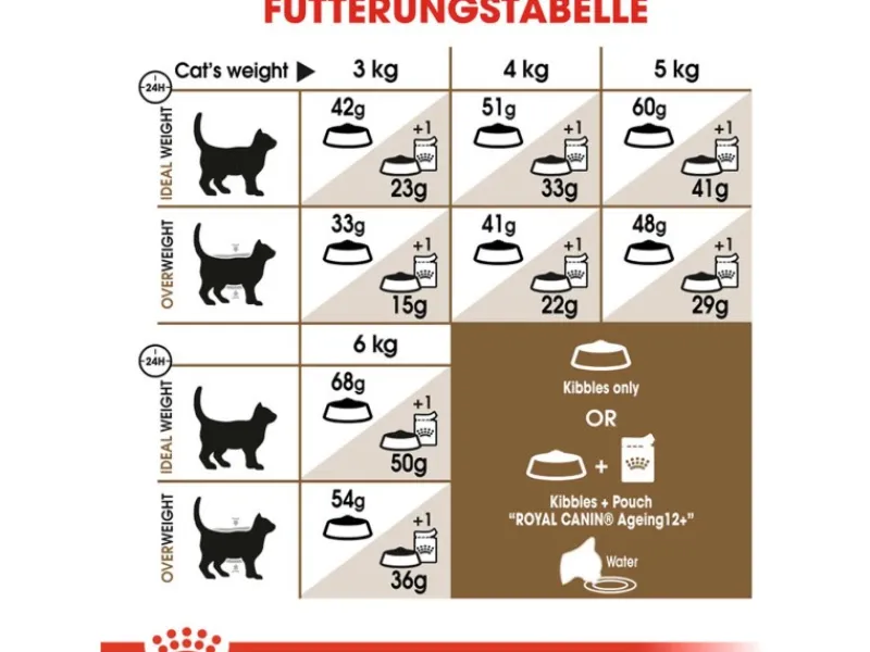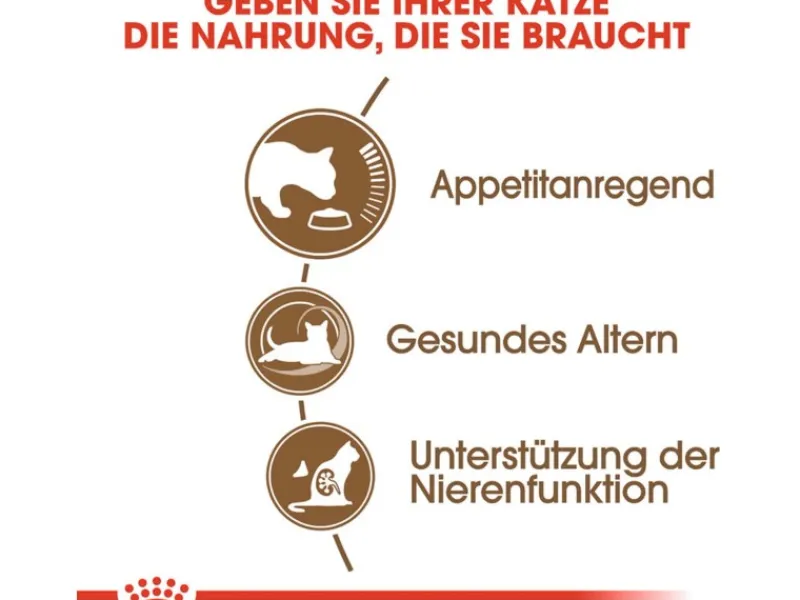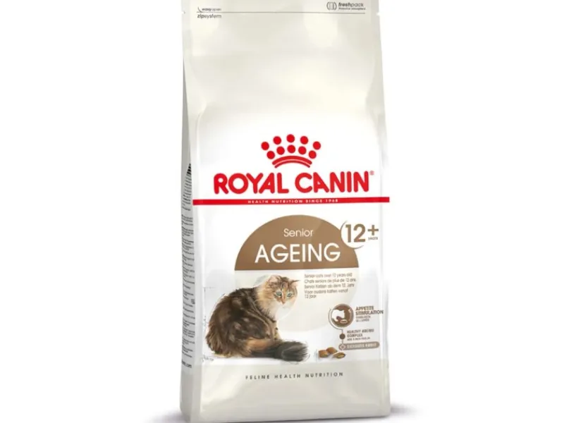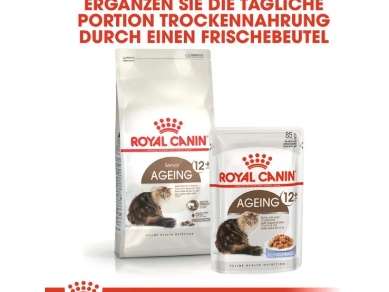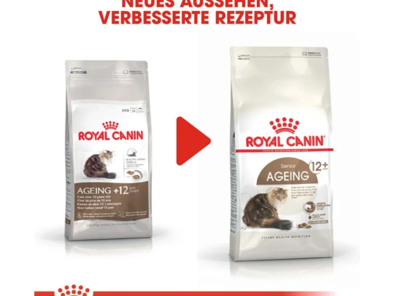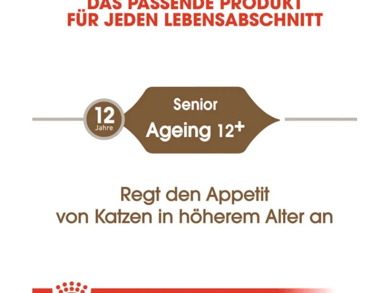 Alternde Katzen haben andere Ernährungsbedürfnisse als junge Kätzchen. Deshalb ist es wichtig, die Ernährung der Katze mit zunehmendem Alter anzupassen. So kann sichergestellt werden, dass ihre Bedürfnisse erfüllt werden. Einige Senior-Katzen erleben mit zunehmendem Alter ein Nachlassen ihres Geschmacks- und Geruchssinns, was typischerweise zu Appetitlosigkeit und damit zu einer geringeren Nahrungsaufnahme führen kann. Royal Canin Senior Ageing 12+ enthält sehr schmackhafte Kroketten mit einer doppelten Textur (außen knusprig, innen weich), die den Appetit älterer Katzen anregen. Royal Canin Senior Ageing 12+ ist ideal für Katzen ab einem Alter von 12 Jahren geeignet. Die Katzennahrung ist speziell auf die besonderen Bedürfnisse bei der Ernährung älterer Katzen abgestimmt.
