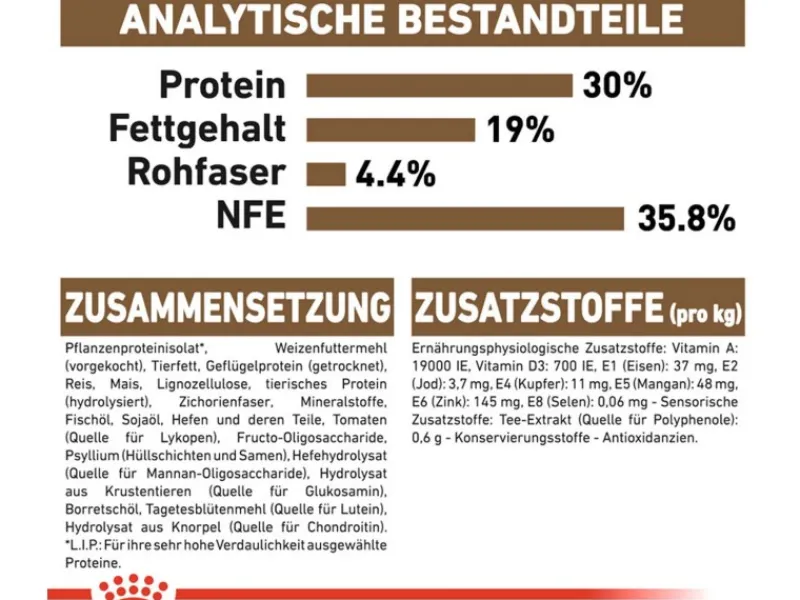 Pflanzenproteinisolat*, Weizenfuttermehl (vorgekocht), Tierfett, Geflügelprotein (getrocknet), Reis, Mais, Lignozellulose, tierisches Protein (hydrolysiert), Zichorienfaser, Mineralstoffe, Fischöl, Sojaöl, Hefen und deren Teile , Tomaten (Quelle für Lykopen), Fructo-Oligosaccharide, Psyllium (Hüllschichten und Samen), Hefehydrolysat (Quelle für Mannan-Oligosaccharide), Hydrolysat aus Krustentieren (Quelle für Glukosamin), Borretschöl, Tagetesblütenmehl (Quelle für Lutein), Hydrolysat aus Knorpel (Quelle für Chondroitin).*L.I.P.: Für ihre hohe Verdaulichkeit ausgewählte Proteine.