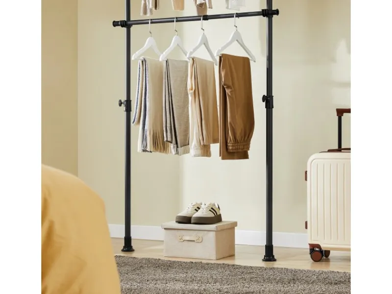 Mit der verstellbaren Konstruktion lassen sich Querstangen und Layout an Raum und Kleiderlänge anpassen – Jacken, Kleider und Hemden hängen knitterarm und übersichtlich.