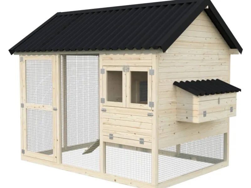 Der neue Palmako Hühnerstall Chick 6,7 m² aus unbehandelter nordischer Fichte, bietet alles, was das Homefarming-Herz begehrt. Hier können die Hühner sich sowohl im Stall als auch im integrierten Auslauf bewegen. Dank einer Klappe können die gelegten Eier dem Legekasten ganz bequem von aussen entnommen werden. Der Hühnerstall ist bereits mit einem Blechdach versehen. Einfacher Aufbau dank exakt vorgefertigter Elemente. Versehen Sie den Stall nach dem Aufbau mit einer Grundierung und einem Anstrich zum Schutz gegen Witterungseinflüsse.