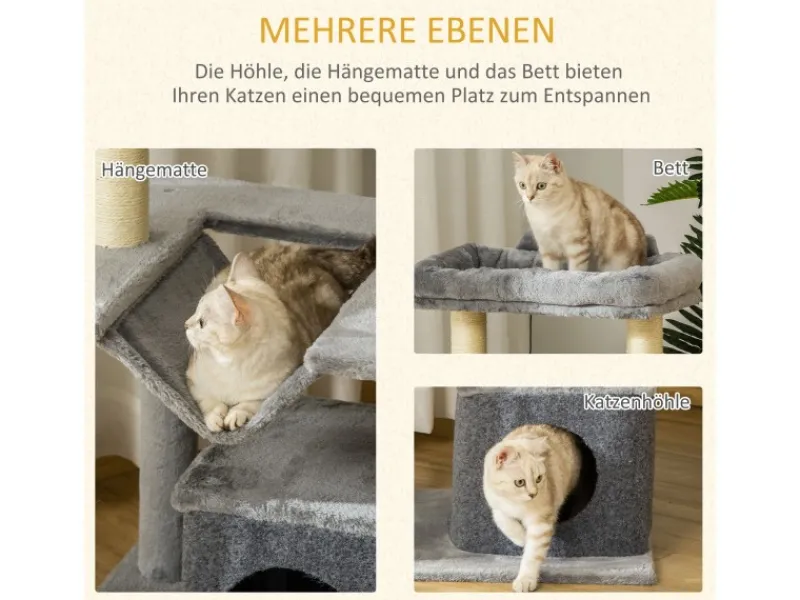 Dieser Kratzbaum von PawHut ist ein idealer Ort, um Energie freizusetzen, zu entspannen oder den Drang zum Kratzen und Klettern zu befriedigen. Er enthält Kratzflächen, eine Höhle, eine Sitzstange, eine Hängematte, ein Bett und ein interaktives Katzenspielzeug. Er ist aus stabilen Spanplatten gefertigt und für Sicherheit und Komfort mit weichem Plüsch bezogen. Der Eckkratzbaum ermöglicht es Ihren Katzen, ihre Krallen scharf und gesund zu halten.
