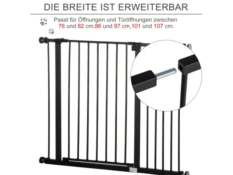 Mit diesem praktischen Absperrgitter von PawHut können Sie Ihren pelzigen Schützling effektiv vor gefährlichen Raumabschnitten schützen. Ohne Bohren und nur mit einem praktischen Klemmmechanismus lässt sich das Türschutzgitter mühelos an nahezu jedem Türrahmen anbringen. Es ist verstellbar von 76 cm bis 107 cm und passt sich somit verschiedenen Türbreiten an. Ideal, um Ihren Vierbeiner sicher in gewünschten Bereichen zu halten.