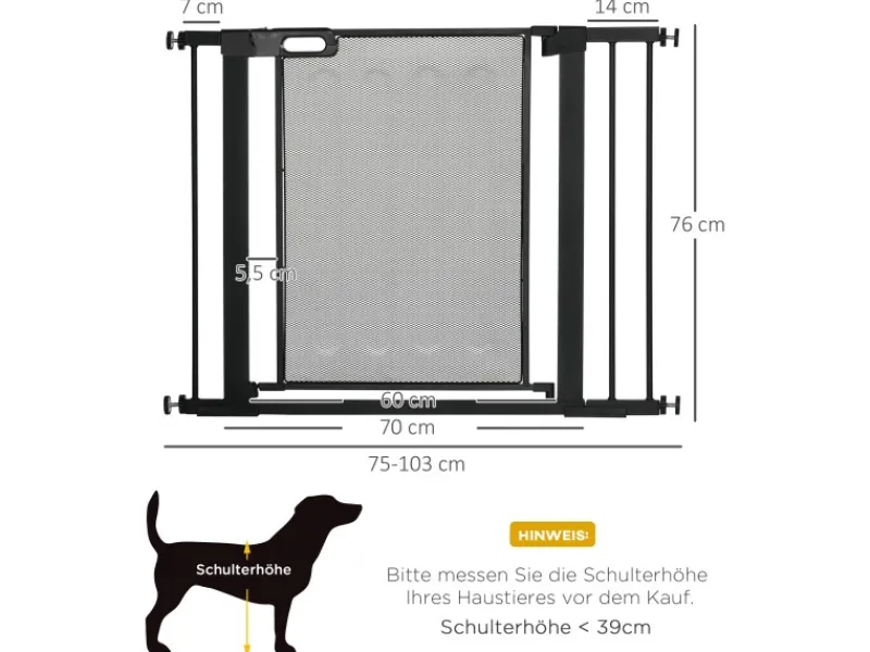 Halten Sie Hunde mit dem PawHut-Treppenschutzgitter aus bestimmten Bereichen fern. Es eignet sich für Flure, Türen und Treppen und ist in der Breite von 75 bis 103 cm verstellbar – perfekt für unterschiedlich große Öffnungen. Dieses Türgitter schließt sich automatisch, wenn es in einem Winkel von weniger als 90° geöffnet wird – Sie brauchen sich also keine Sorgen mehr zu machen, dass es leicht geöffnet bleibt. Dank der Druckbefestigung ist es einfach zu montieren.
