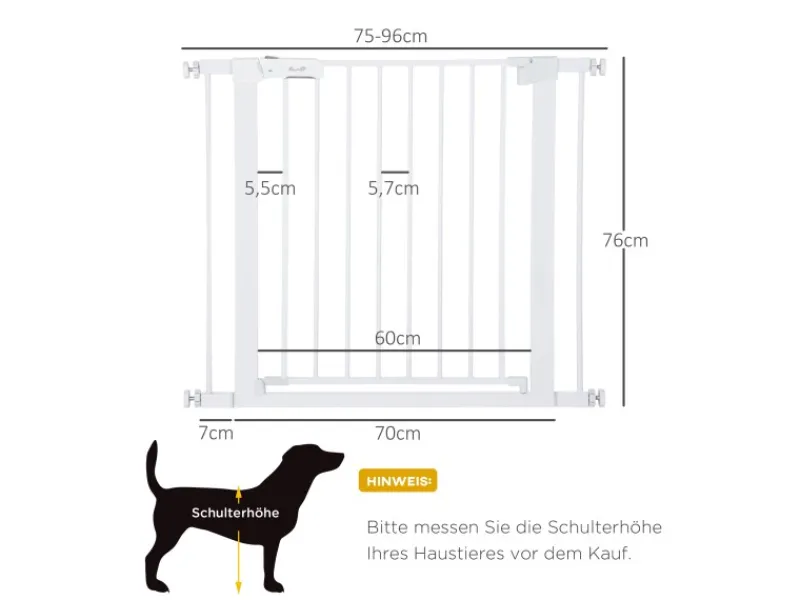 Suchen Sie nach einem Trenngitter für Ihren Hund? Dieses weiße Metallgitter ist eine schnelle und einfache Lösung, um Ihre Hunde zu schützen und einen gewünschten Bereich für sie unzugänglich zu machen. Dank der Spannmechanik ist die Montage ein Kinderspiel: Sie befestigen das Tor einfach zwischen zwei Wänden. Mit seiner anpassbaren Breite (75-96 cm) passt es in nahezu jeden Tür- und Flurbereich. Sorgen Sie jetzt mit diesem praktischen Hundegitter von PawHut für die Sicherheit Ihrer Vierbeiner!