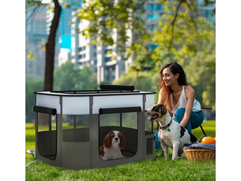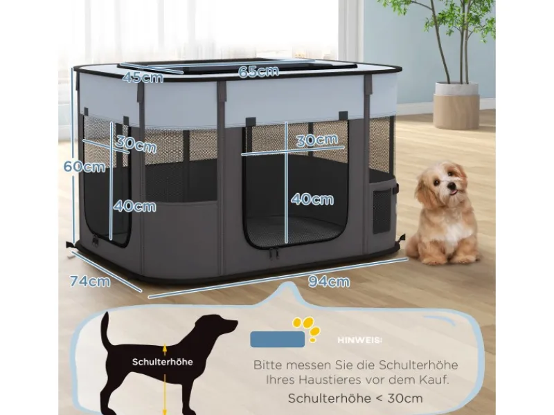 ● Falten Sie das Haustier-Spielgehege für einfache Lagerung und Reisen zusammen