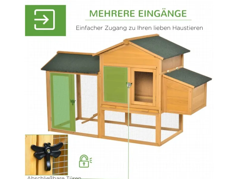 Dieser moderne Zwerghühnerstall von PawHut ist das ideale Zuhause für ihre Zwerghühner! Ein Ruheraum, ein Brutkasten und eine große Auslauffläche bieten ihren Zwerghühnern viel Platz zum Brüten, Picken und Laufen. Der Brutkasten verfügt über ein aufklappbares Dach so, dass die Eier behutsam entwendet werden können. Dank seiner Bodenwanne ist der Käfig leicht zu reinigen. Zudem ist der Zwerghühnerstall wetter- und wasserbeständig.