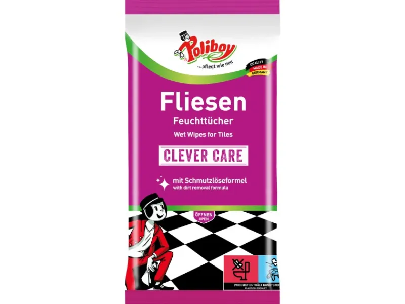 Die Poliboy Fliesen Feuchttücher eignen sich für die Reinigung von Fliesen- und Steinflächen, z.B. in Küche, Flur und Bad. Sie sind ideal für die schnelle Reinigung zwischendurch. Neben Böden können auch Wandfliesen oder Treppen schnell und bequem – ohne lästigen Wischeimer – gereinigt werden. Ein Nachwischen bzw. Trockenreiben ist nicht notwendig. Durch die spezielle Wellenstruktur und die kraftvolle Reinigungslotion nehmen die Tücher den Schmutz sehr gut auf. Zudem bilden neu entwickelte Wirkstoffe bei jedem Wischen einen unsichtbaren Schutz auf der Oberfläche, der bei regelmäßiger Anwendung für ein leichteres Reinigen sorgt – Flecken lösen sich spürbar einfacher. Wertvolle Parfümöle geben dem Raum gleichzeitig einen angenehm frischen Duft. Saubere Ergebnisse mit den Clever Care Feuchttüchern von Poliboy!