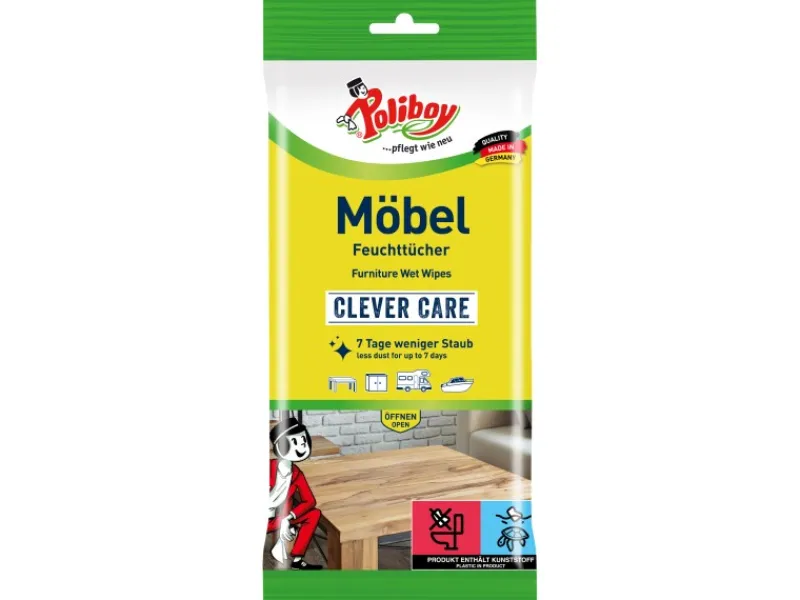 Die Poliboy Möbel Feuchttücher sind vielfältig einsetzbar: Im Haus, Büro oder Caravan. Insbesondere Oberflächen aus Holz, aber auch Kunststoff, Glas und Metall werden mit diesen getränkten Tüchern optimal gereinigt. Verschmutzungen werden mit einem Wisch entfernt – ohne Nachpolieren sind die Oberflächen streifenfrei sauber. Der Staub wird zudem nicht aufgewirbelt, sondern im Tuch festgehalten. Auf der behandelten Oberflächen ist die Staubablagerung für bis zu 7 Tage reduziert. Durch hochwertige Parfümöle entsteht bei der Anwendung ein angenehmer, frischer Duft. Richtig abstauben mit Clever Care Feuchttüchern von Poliboy!