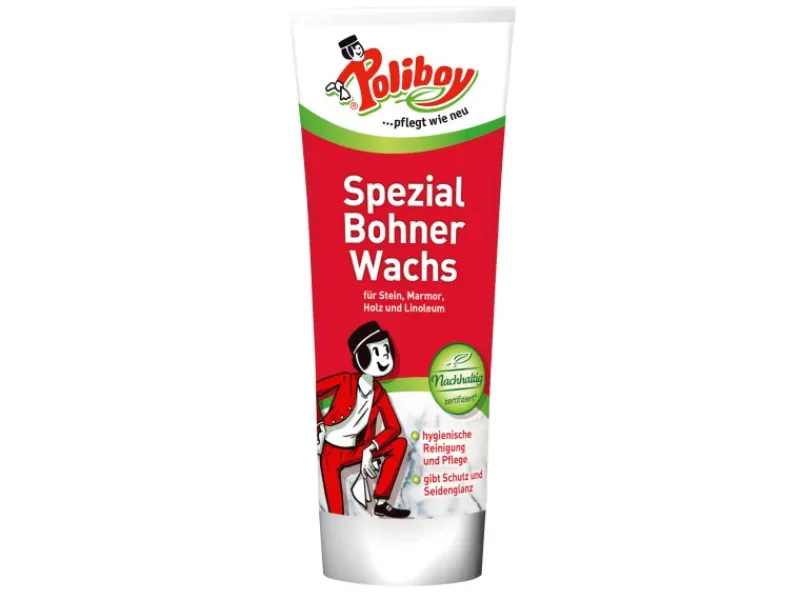 Das Poliboy Spezial Bohner Wachs ist eine pastöse Pflege für Böden aus Holz, Stein oder Kunststoff, genauso wie empfindliche Böden aus PVC, Gummi, Vinyl, Marmor oder Kork. Durch die hochwertigen Wachse entsteht auf den behandelten Flächen ein schöner Seidenglanz, der durch Polieren noch gesteigert werden kann. Zusätzlich bildet sich ein wirkungsvoller Schutz vor äußeren Einflüssen. Der von der Wachsschicht aufgenommene Schmutz wird bis zur nächsten Reinigung fixiert und kann dann problemlos bei einem Neuauftrag entfernt werden.
