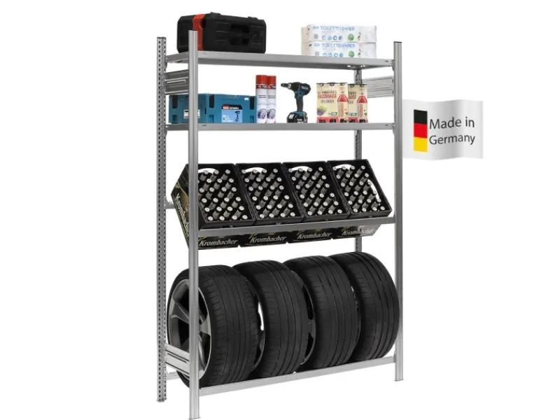 Die Produktion des Regals erfolgt nach höchsten Qualitätsstandards in Deutschland. Die Fertigung ist nach ISO 9001 zertifiziert. Das Getränkekisten- & Reifenregal wird kompakt und sehr gut verpackt geliefert und kann kinderleicht innerhalb von 15-20 Minuten aufgebaut werden. Selbstverständlich sind die Fachböden flexibel in der Höhe verstellbar. Durch die flexible Einstellungen, lassen sich auch andere Kisten abseits von Getränkekisten sehr praktisch lagern.