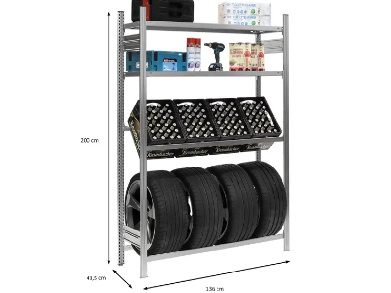 Das Regal bietet Platz für 4 Kisten & 4 Sommer- oder Winterreifen sowie 2 zusätzliche Ablageflächen
