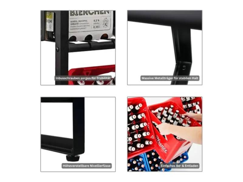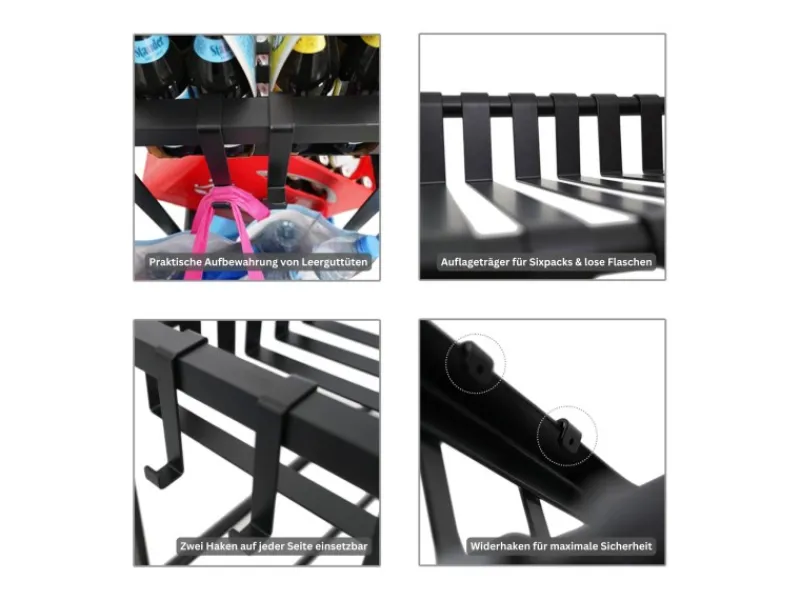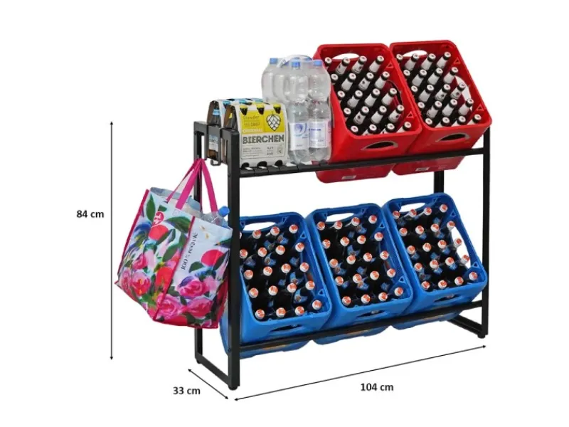 Die 2 Lagerebenen bieten Platz für jeweils 3 Getränkekisten und ermöglichen so eine übersichtliche und gut organisierte Lagerung. Für noch mehr Flexibilität sind 6 abnehmbare Auflageträger im Lieferumfang enthalten, mit denen sich auch kleinere Flaschen oder Sixpacks sicher verstauen lassen. Zusätzlich verfügt das Regal über 2 seitlich anbringbare Haken, die sich ideal zum Aufhängen von Leergutbeuteln oder Einkaufstaschen eignen.
