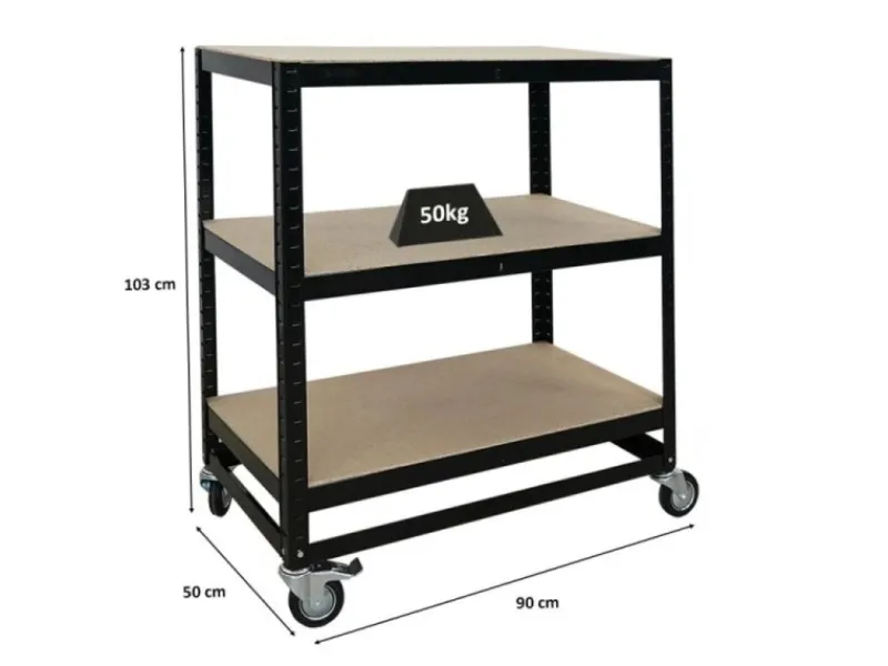 Mit einer Höhe von 100 cm, Breite von 90 cm und Tiefe von 50 cm bietet das Regal großzügigen Stauraum, bleibt dabei aber wendig genug für enge Gänge oder schmale Flächen.