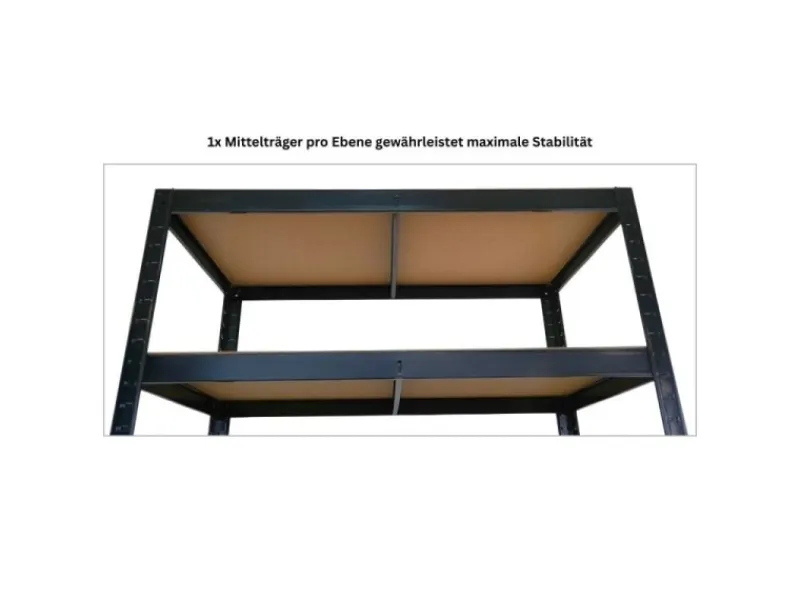 Die 3 Spanplattenböden lassen sich im 2,5 cm-Raster individuell in der Höhe verstellen – perfekt zur Lagerung von Werkzeugen, Ersatzteilen, Kisten oder Kleinteilen. Jeder Boden trägt bis zu 50 kg, ein integrierter Mittelträger sorgt auf jeder Ebene für zusätzliche Stabilität und Sicherheit.