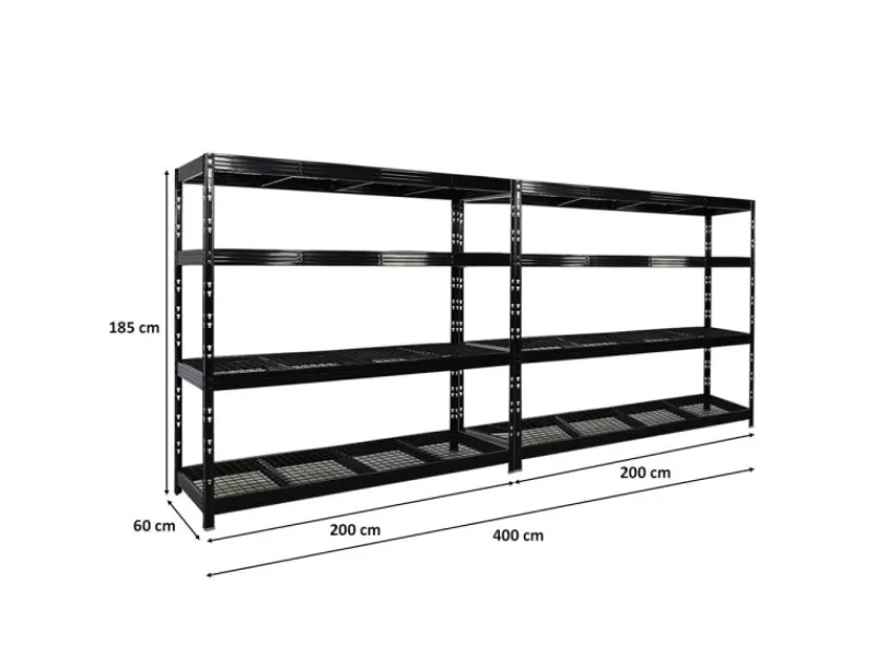 Das Schwerlastregal ist 180 cm hoch, 200 cm breit und 60 cm tief. Die Farbe ist Schwarz