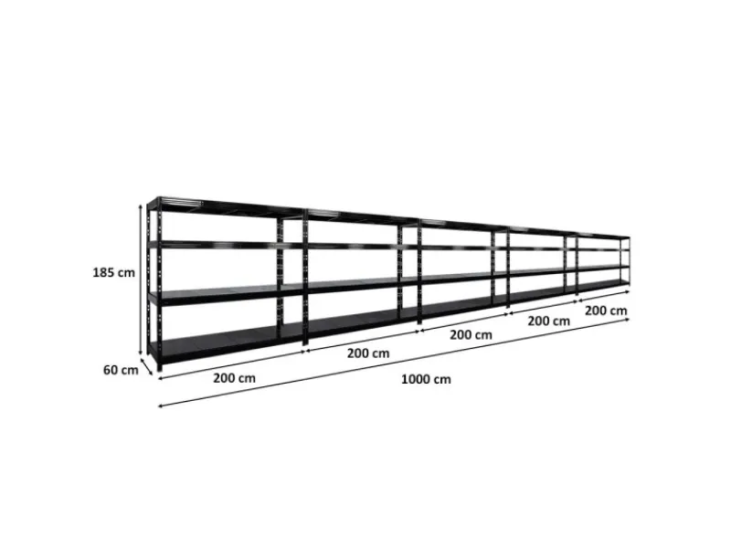 Das Schwerlastregal ist 180 cm hoch, 200 cm breit und 60 cm tief. Die Farbe ist Schwarz