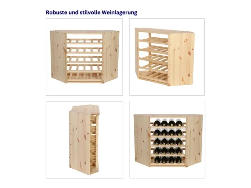 Das Weinregal besteht aus massivem Kiefernholz, was eine langlebige stabile Lagerung gewährleistet