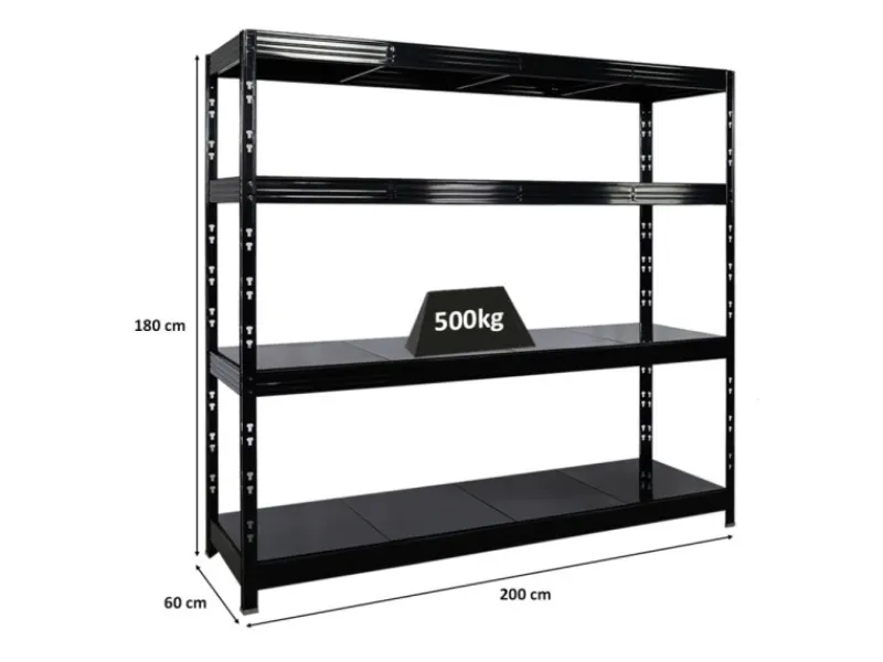 Das Schwerlastregal ist 180 cm hoch, 200 cm breit und 60 cm tief. Die Farbe ist Schwarz