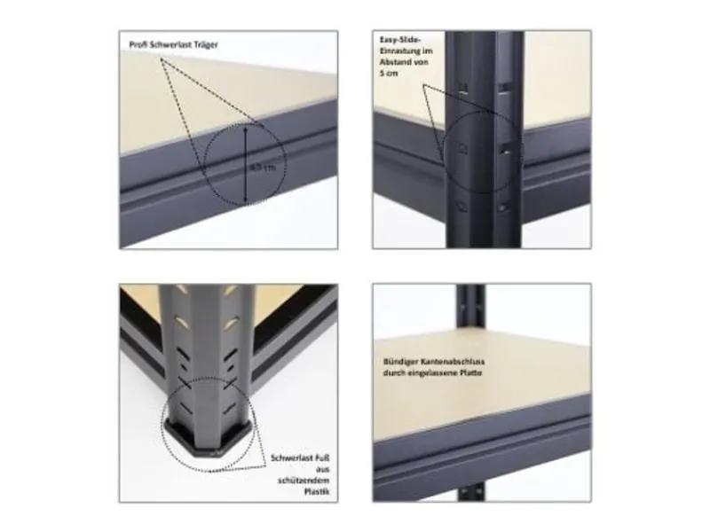 Der Aufbau ist einfach und erfolgt durch Steckmontage . Selbstverständlich sind die 4 Fachböden in der Höhe verstellbar. Die Einlegeböden aus MDF-Holzplatten sind mit 6,5 mm sehr robust, belastbar und stabil. Die Höhen können im 50mm Abstand angepasst werden.